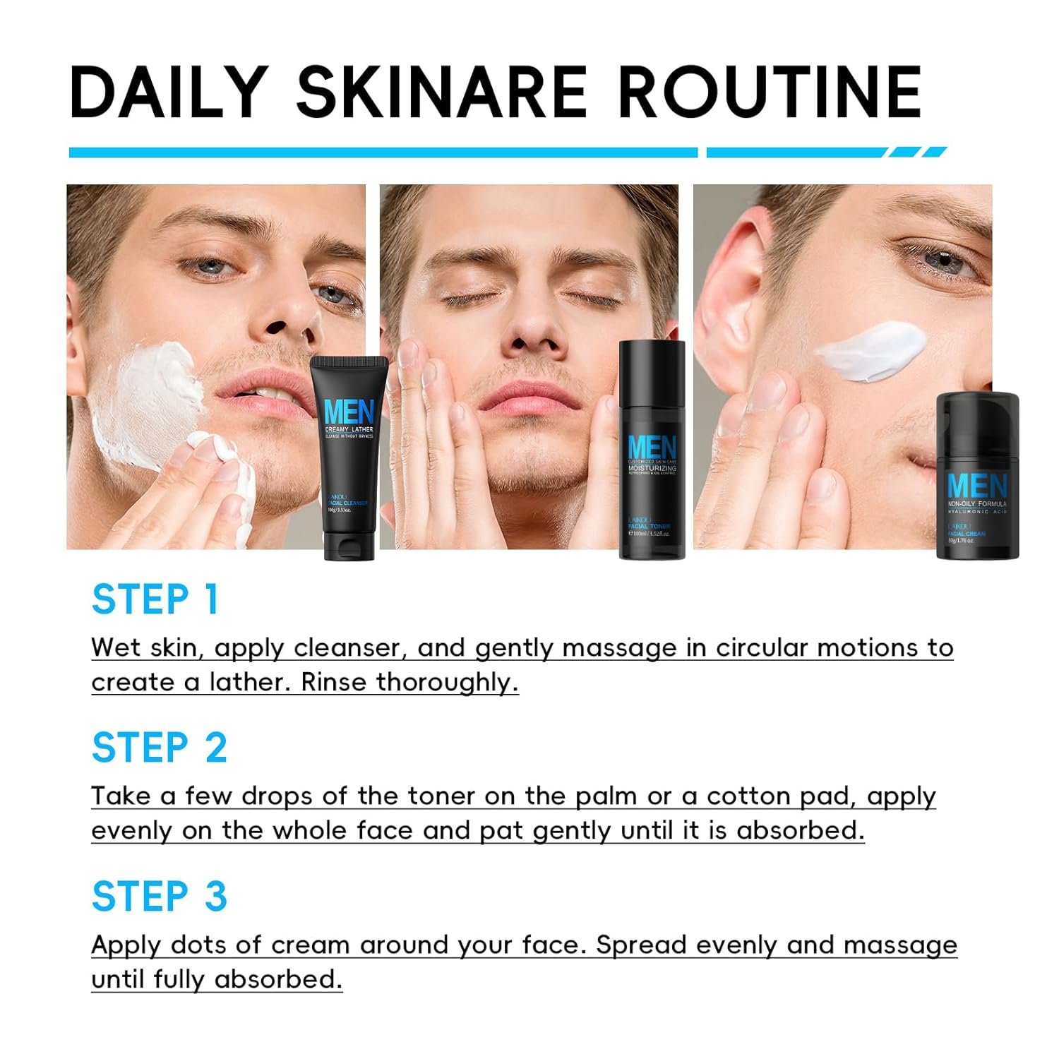 【Men Skin Care Set】LAIKOU men skin care set includes men face cream (1.76 oz), cleanser (3.53 oz) and toner (3.52 oz), which can meet the basic and comprehensive skin care needs of every man. It is very suitable as your skin care set or as a gift to others