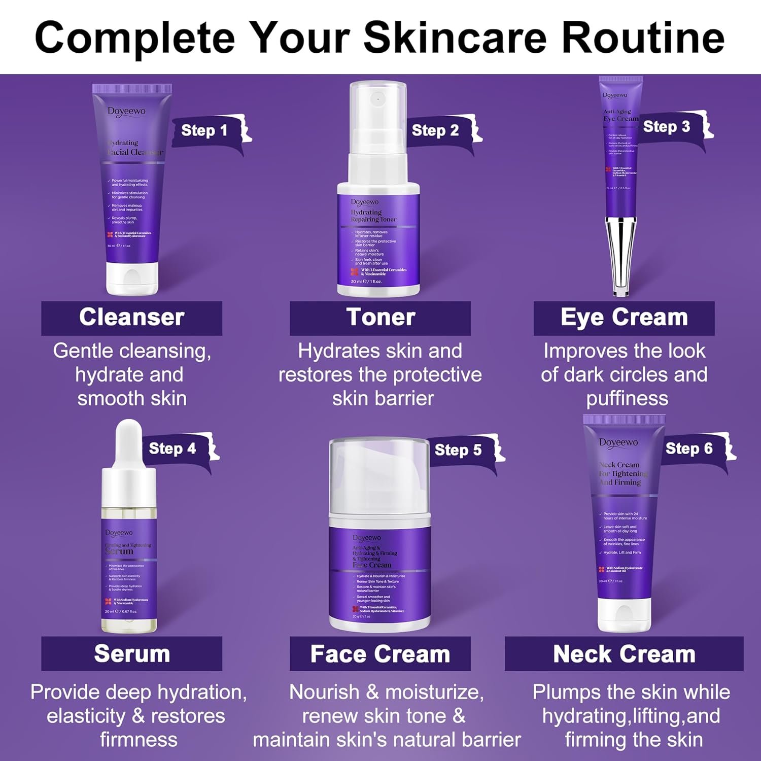 Your Skin Care Routine Kit: This skin care kit includes everything needed for younger-looking skin.Featuring a facial cleanser,toner,eye cream,serum,face cream and neck cream.Your all-in-one skincare set for controlling oil,hydrating,moisturizing,tightening pores,smoothing,repairing,firming,lifting and anti-aging