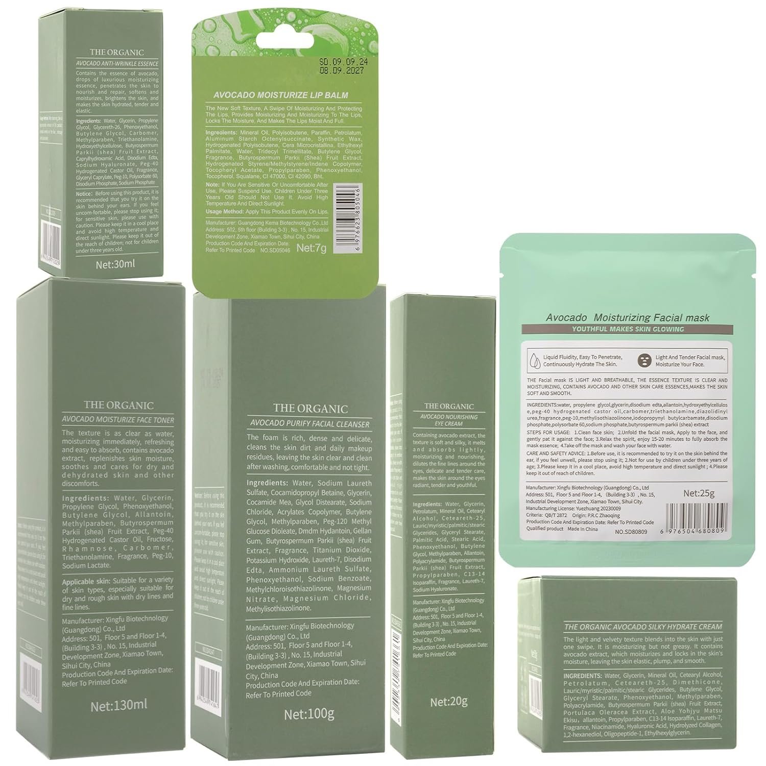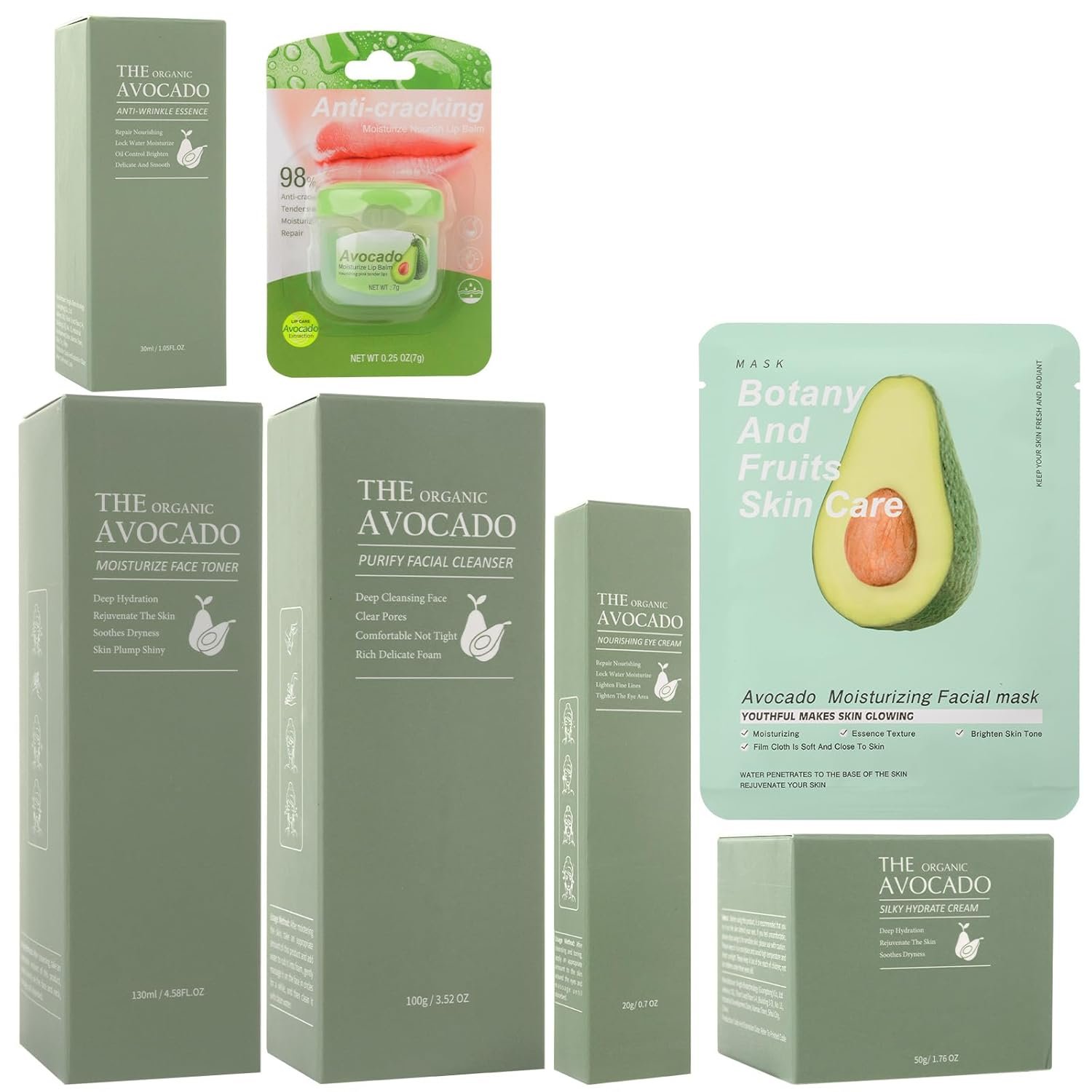 9 Pcs Avocado Skincare Sets & Kits: The skincare set with facial cleanser, toner, serum, face cream, eye cream, lip balm, 3 pcs mask to improve skin texture, gently repair dry and damaged skin, and provide moisture for skin
