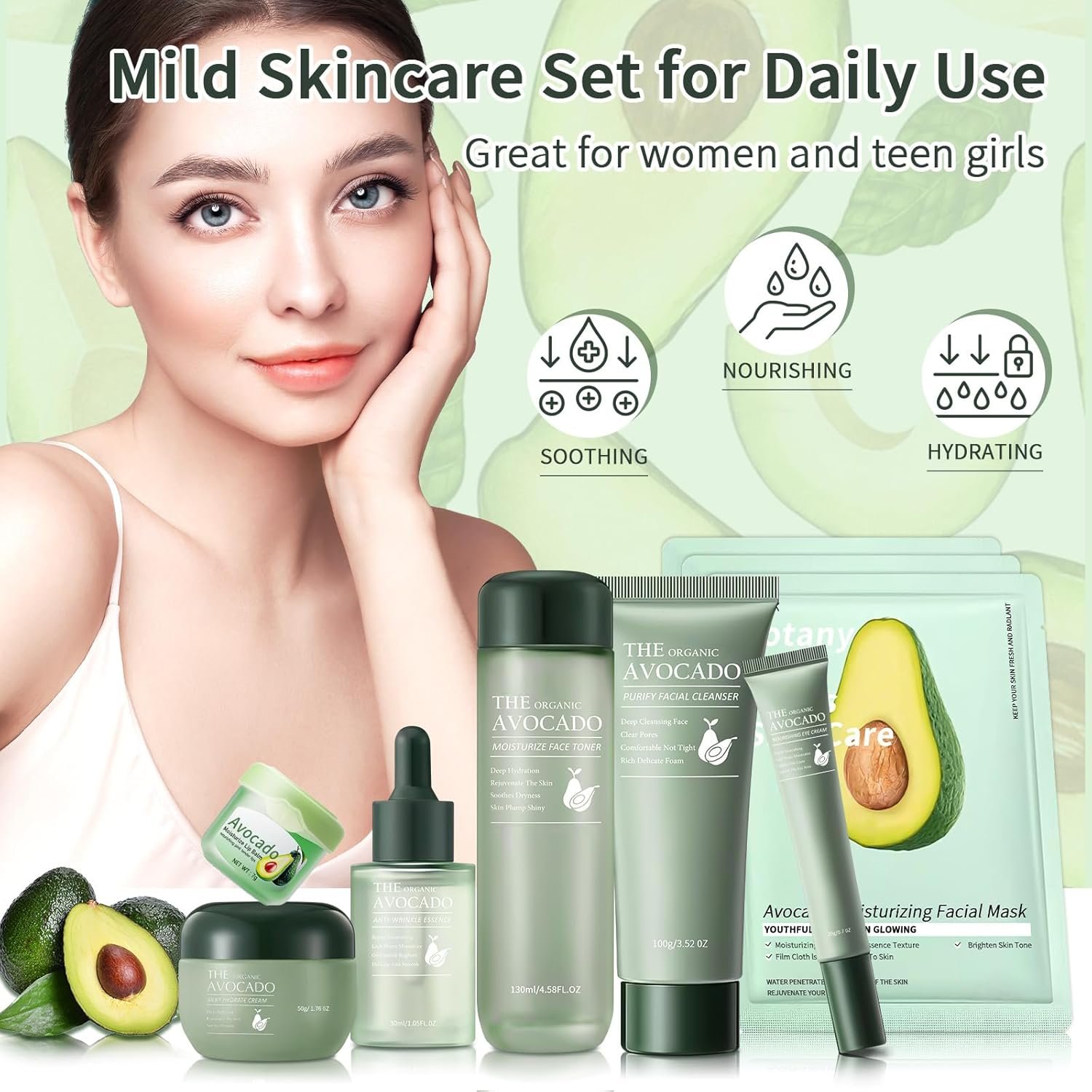 Mild Avocado Extract: Our skncare set contains with avocado essence gently repairs the skin, helps improve pores, clears acne. Its lightweight, non-greasy texture promotes absorption and long-lasting moisturization. Suitable for all skin types