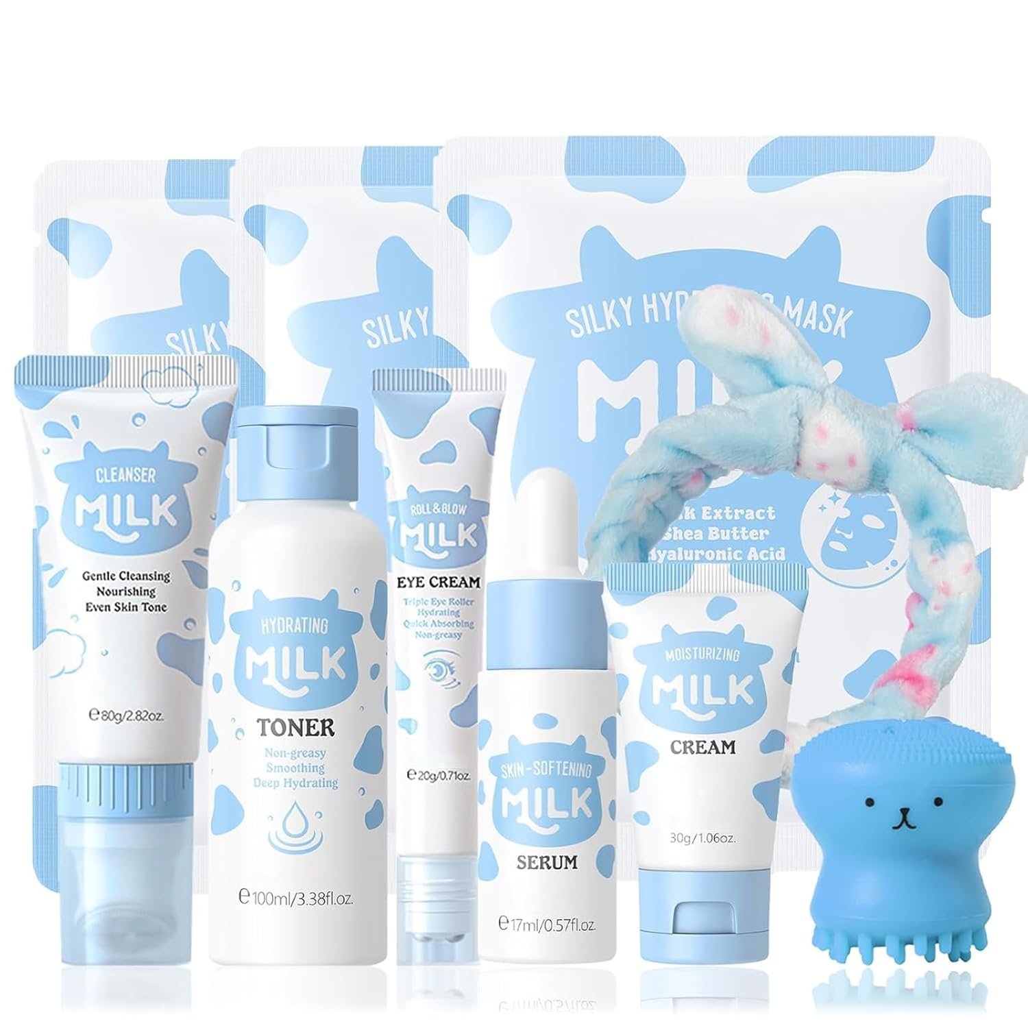 【10 IN 1Milk Facial Care Set】 This skincare for girls 10-12 set includes everything for a complete routine: cleanser, toner, eye cream, serum, moisturizing cream, 3 hydrating masks, a soft headband, and an octopus cleansing brush. Perfect for daily use or as a travel-ready kit.