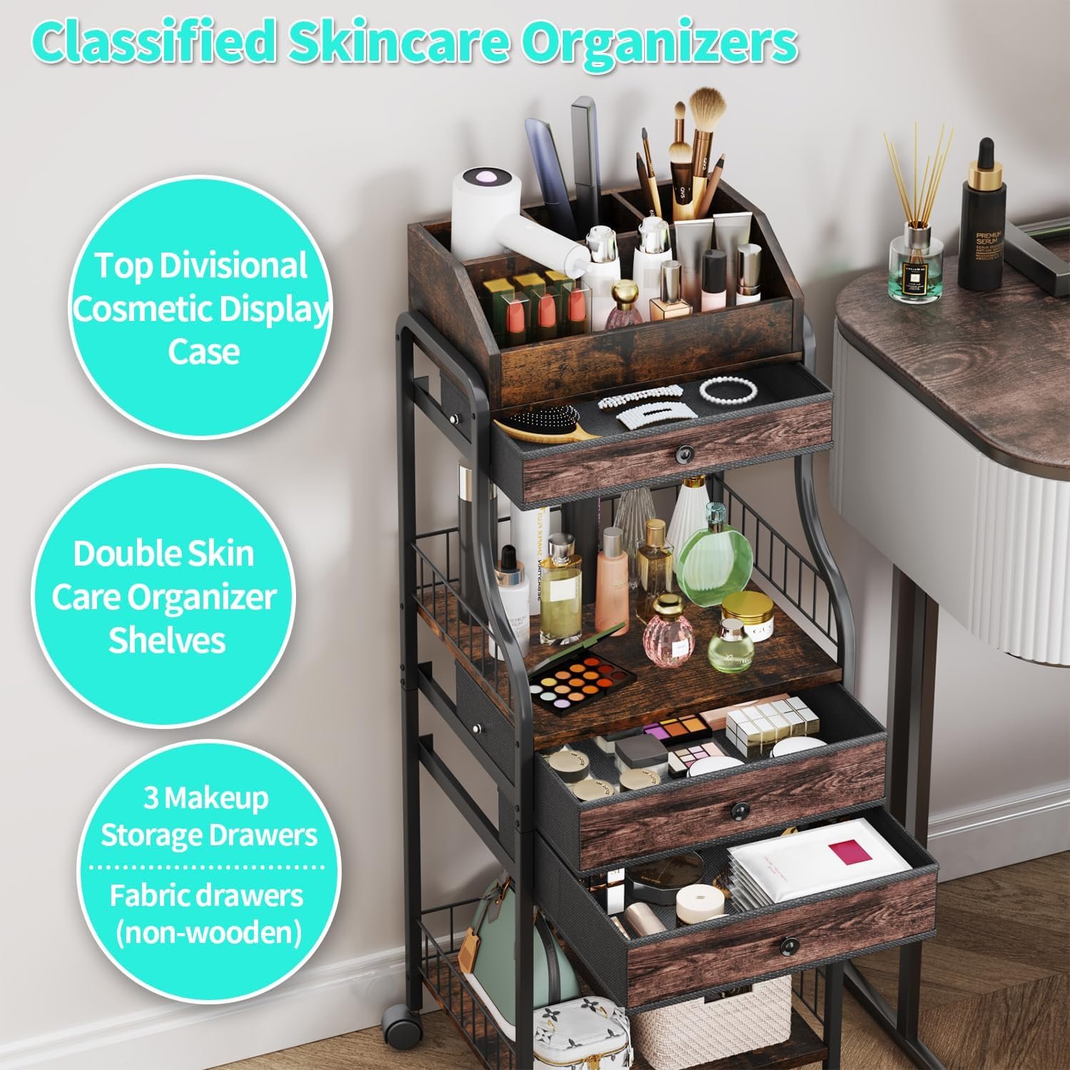 [2025 Latest Floor Skincare Organizers] This skin care organizer features open spaces and storage drawers, designed to keep skincare products, cosmetics, makeup accessories, hair tools, and bags neatly organized. This make up organizers for vanity can be fixed next to bedroom and bathroom vanities. Its stylish modern appearance is perfect for home organization. This makeup organizer for vanity provides ample space for all your beauty essentials, bidding farewell to cluttered countertops and welcoming tidy vanities