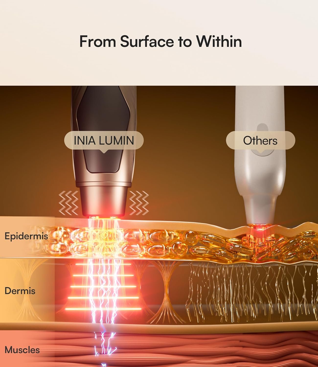 Streamline Your Routine: Why clutter your counter with four separate tools? INIA LUMIN eye skincare device replaces your red light wand, vibration device, heated massager, and metal roller. Designed for all skin, it simplifies your regimen while effectively enhancing radiance and firming skin with consistent use.