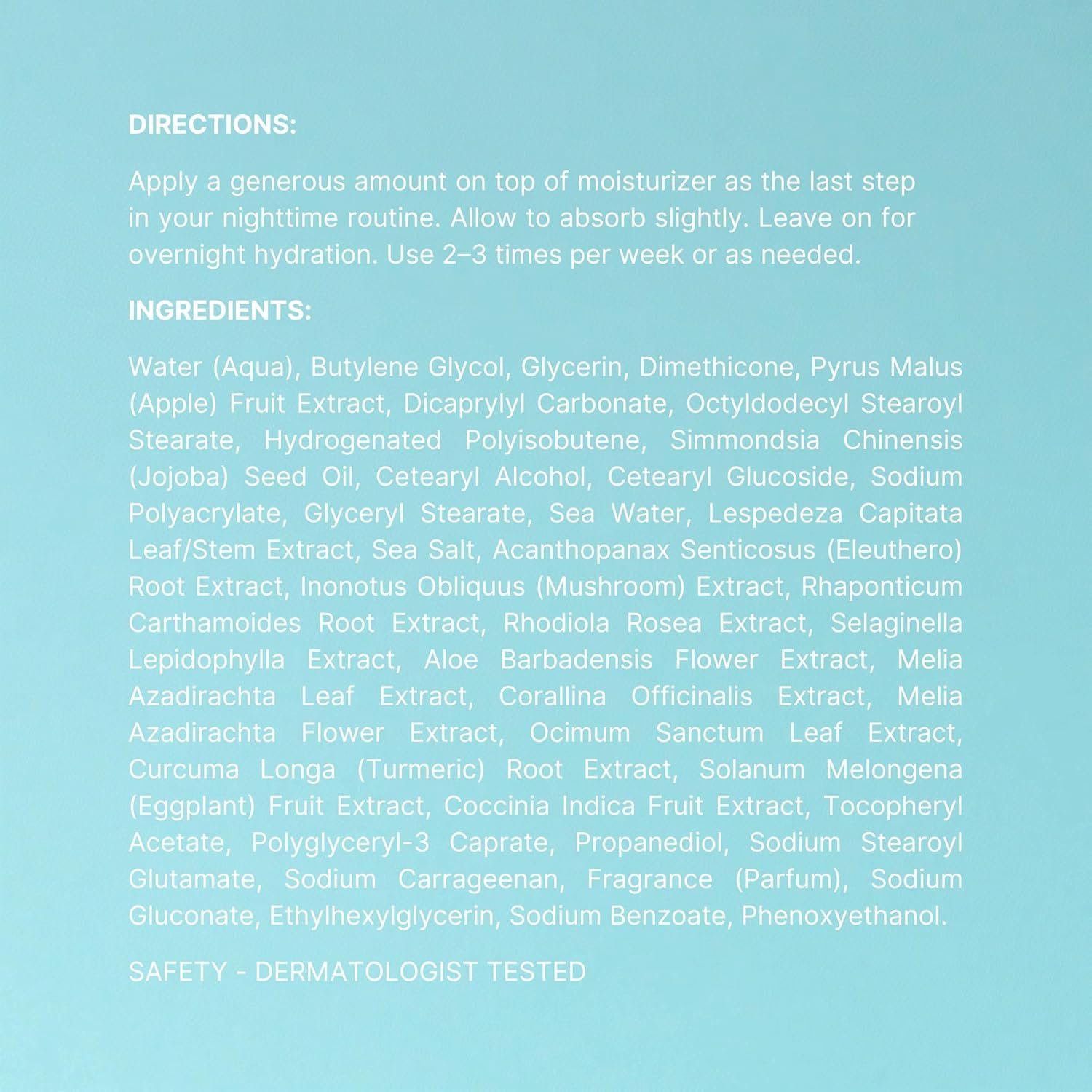 To use, apply a generous layer on top of your moisturizer as the final step in your nighttime routine. Allow it to absorb slightly and leave it on overnight for continuous hydration. Use 2–3 times per week or as needed.
