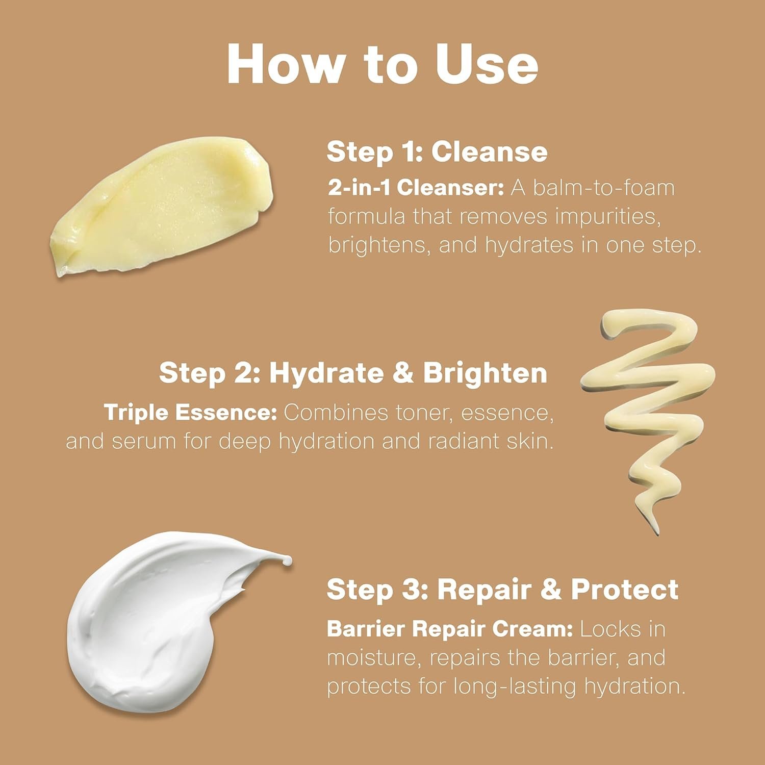 Step 2: HYDRATION & BRIGHTENING – Triple Essence: Combines toner, essence, and serum in one step. Powered by HydroFlux Technology and 8-Layer Hyaluronic Acid, it hydrates, plumps, and brightens with stable Vitamin C.