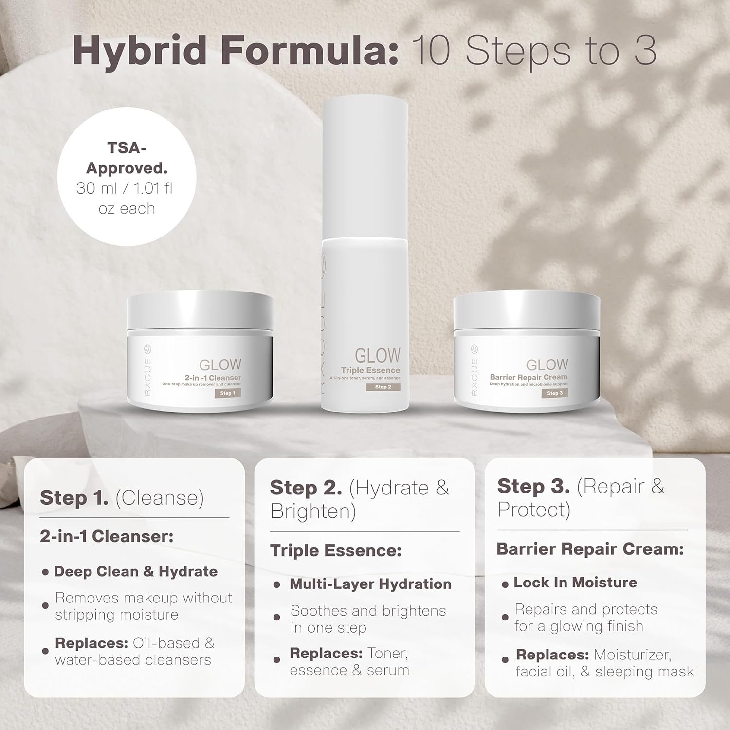 SIMPLIFIED 3-STEP MINI SKIN CARE (PATENT PENDING): This travel size skincare set combines a complete 10 Steps Korean Skincare routine to three powerful hybrid formulas: cleanser, essence, and cream, simplifying routines with innovation and convenience. Perfect for busy lifestyles.