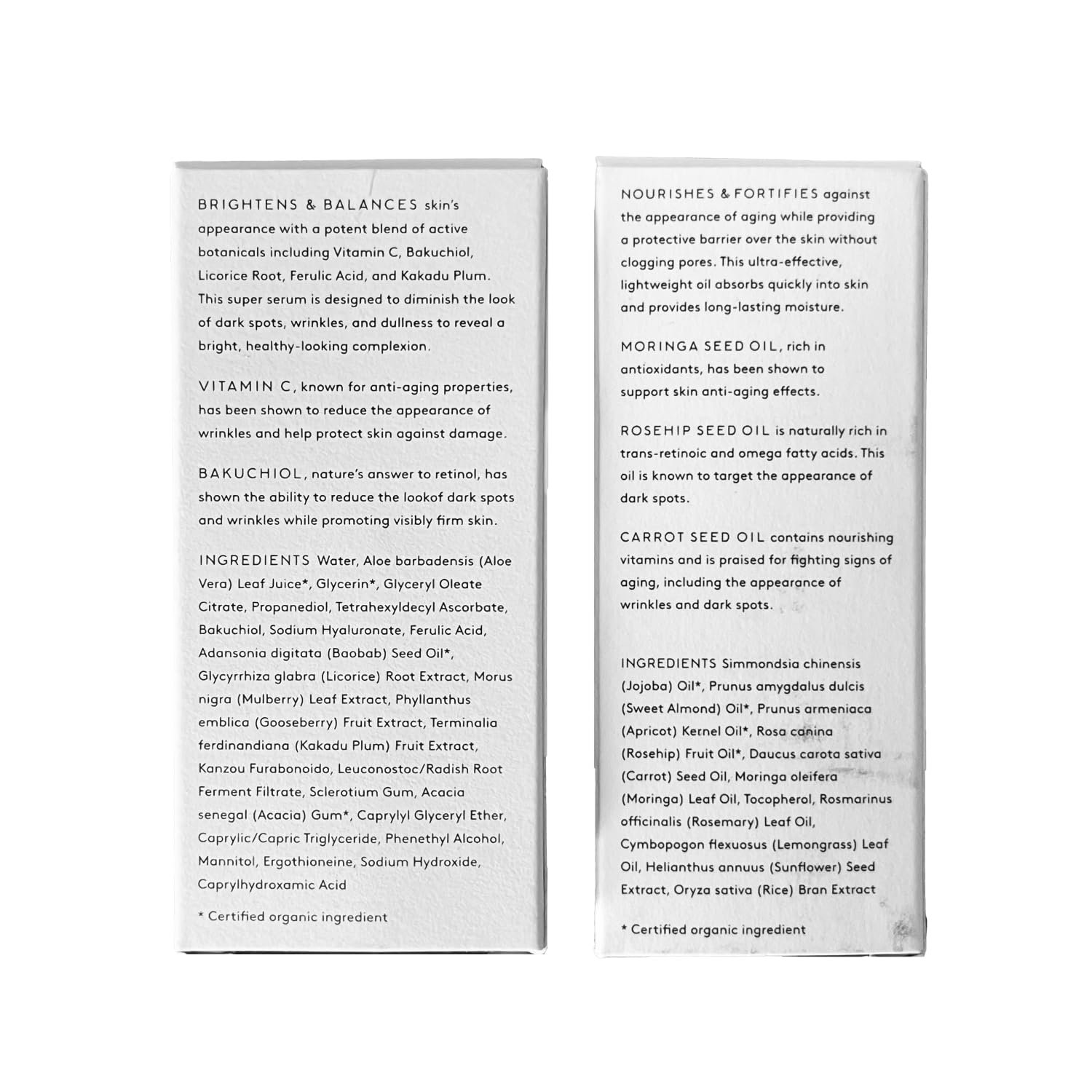 KEY INGREDIENTS: Potent botanicals known for visible results: Bakuchiol for a radiant look and firm feel, Vitamin C for an even tone, Argan Oil for a youthful glow, and Pomegranate Seed Oil for deep nourishment.