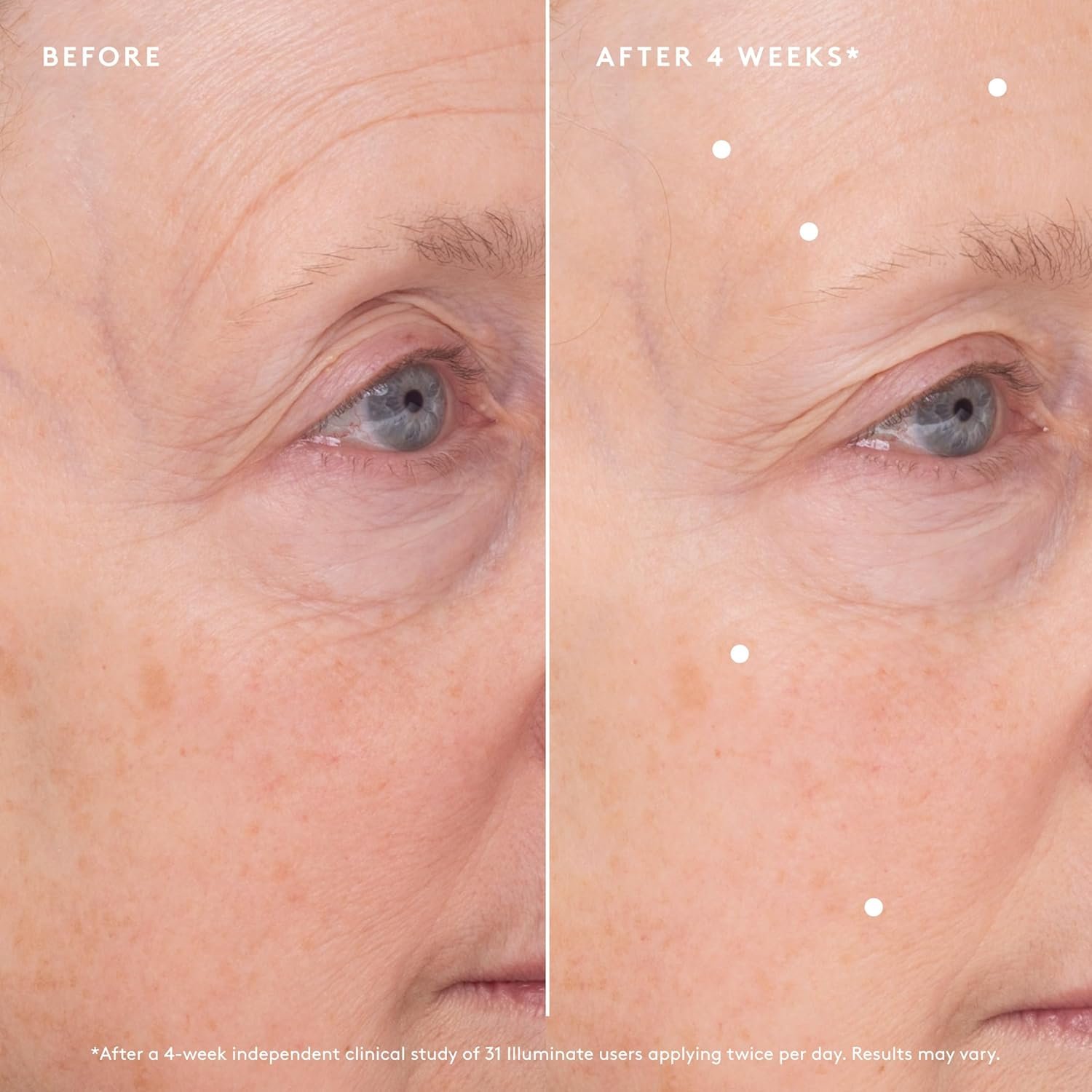 CLINICAL RESULTS: In an Independent Clinical Study with Illuminate users, 94% of users showed a decrease in the appearance of fine lines & wrinkles, 84% improved visible skin radiance, and 100% showed an increase in hydration.*