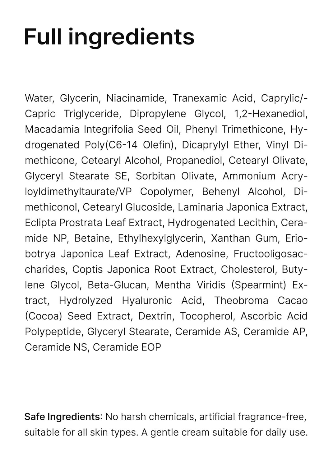 Gentle on Skin: Ideal for sensitive skin, this hypoallergenic cream is fragrance-free and enriched with plant-derived ingredients like Houttuynia Cordata and Allantoin, providing soothing care for reactive skin while illuminating your complexion. A gentle cream suitable for daily use.