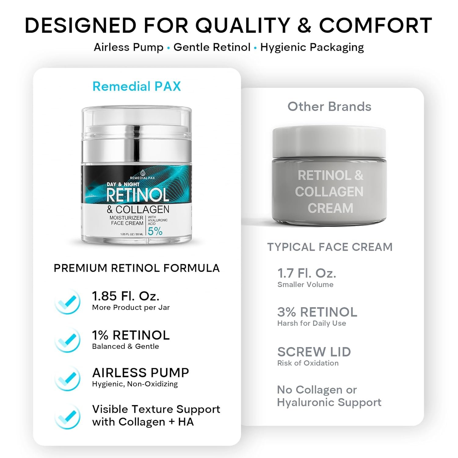 Pure Ingredients: We formulated our retinol moisturizer with collagen and 5% hyaluronic acid to keep your skin hydrated and improve its elasticity