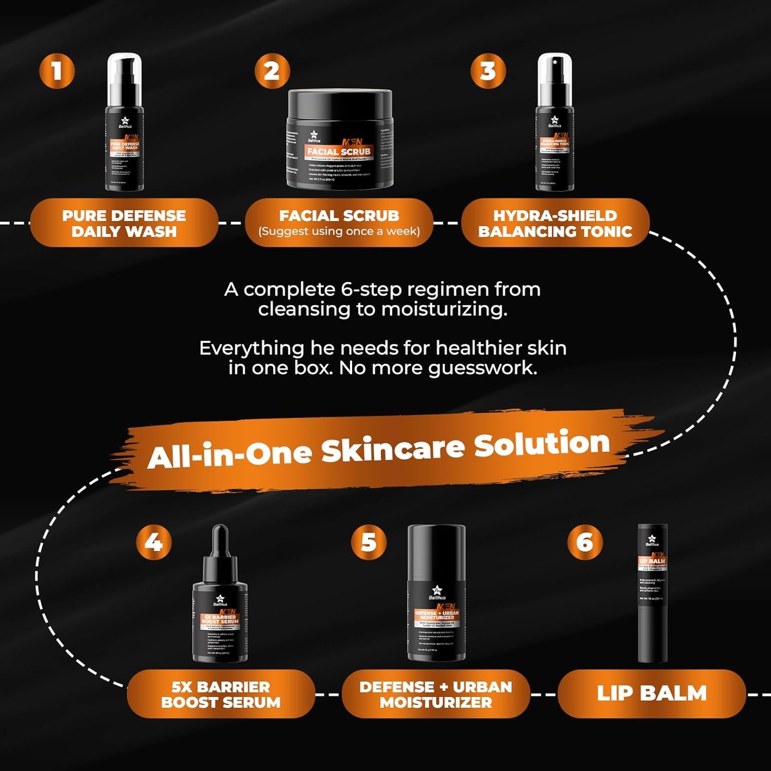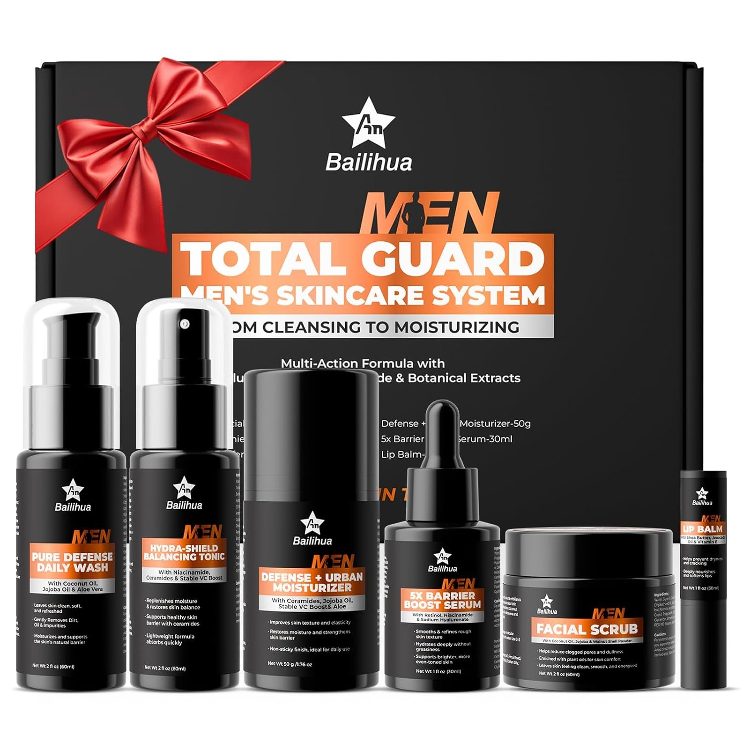 ALL-IN-ONE DAILY FACIAL REGIMEN This 6-step kit includes a Face Cleanser (60ml), Exfoliating Scrub (60ml), Hydrating Toner (60ml), Anti-Aging Serum (30ml), Moisturizing Cream (50g), and Lip Balm (5g). Gentle on skin and designed for all skin types.