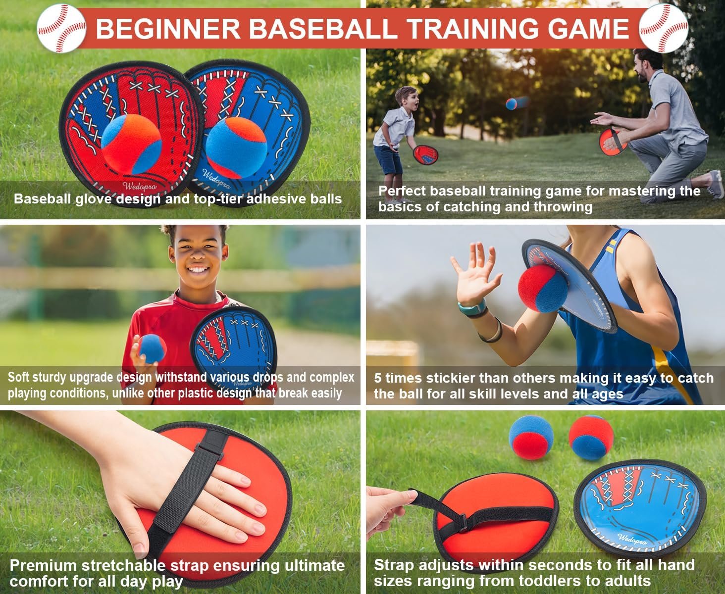 ADJUSTABLE STRAP FOR PERFECT HAND FIT: Our toss and catch game comes with improved, fully adjustable hand straps which are skin-friendly and easy to put on, fitting nicely on any hand sizes. Whether you’re a little kid or a big one, our baseball game includes everything you might need for a complete, highly rewarding and fun playtime experience, designed to bring joy to everyone.