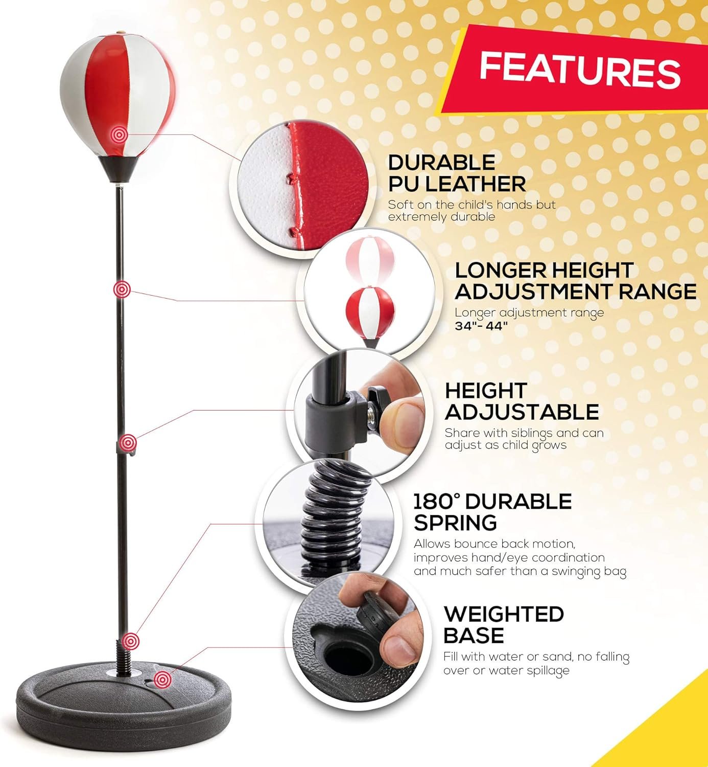EASY TO USE: This standing punching bag comes with a FREE pump and 6 ounce boxing gloves for kids. Perfect kids boxing training equipment! The Bullseye Boxing Kit comes with full instructions so it’s easy to set up. It has an adjustable height from 34” to 44” and the round base is solid with a carry handle for transporting around. Made from Non-Toxic, robust PU Leather.