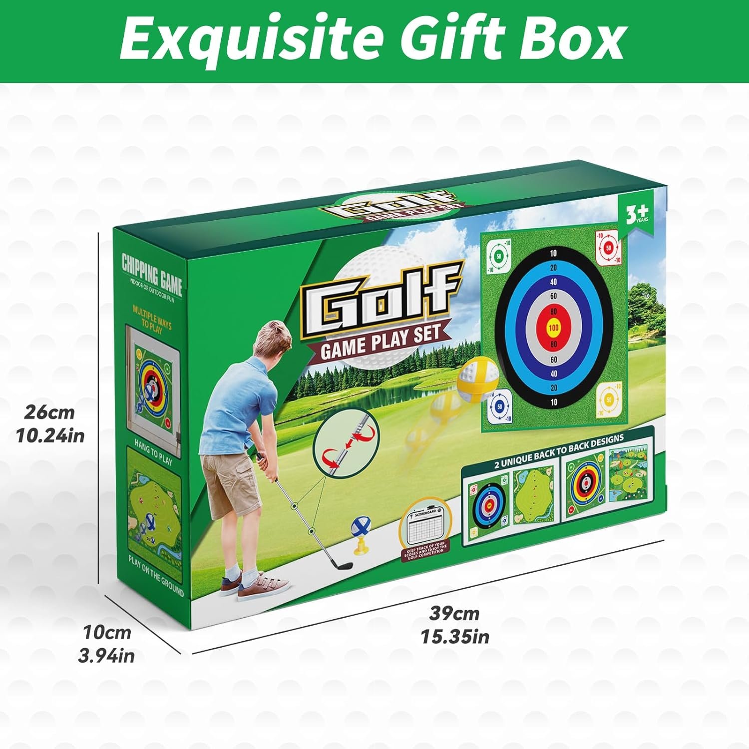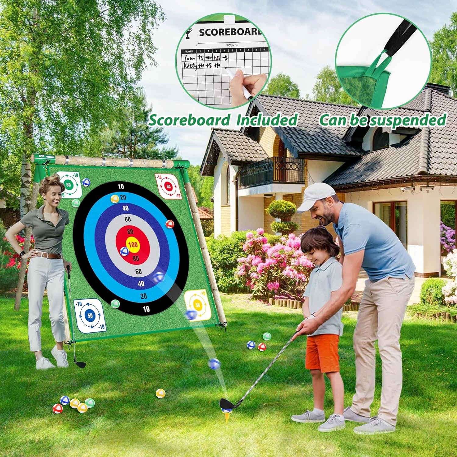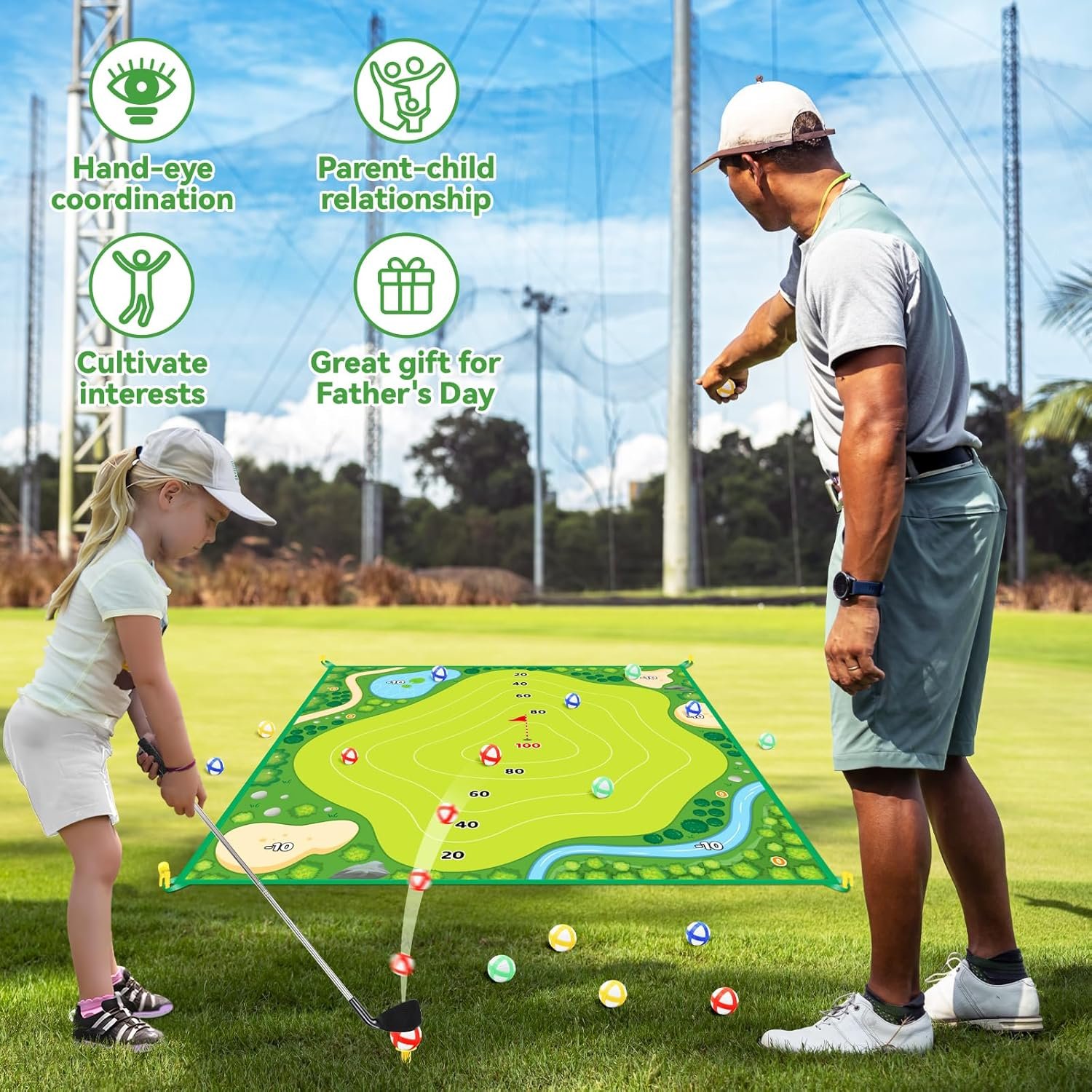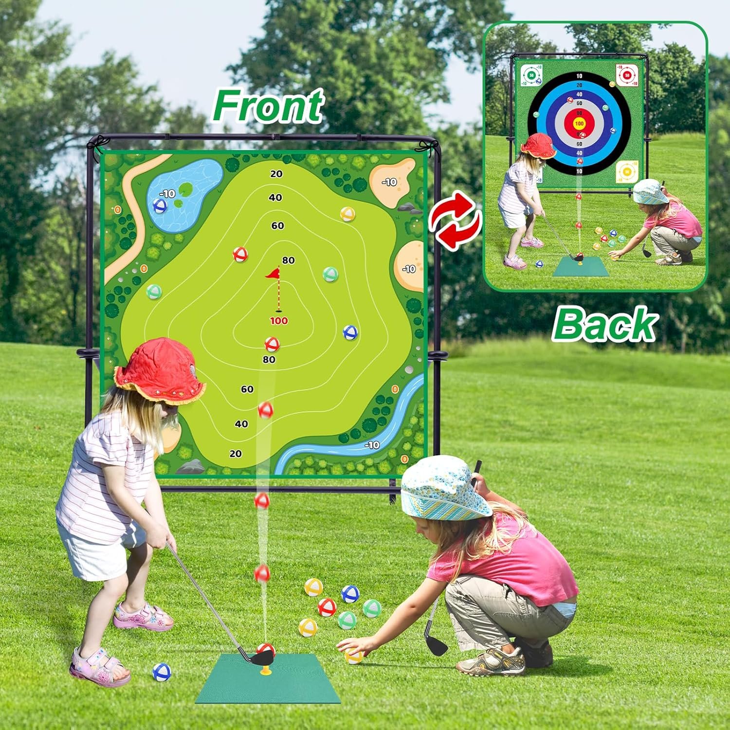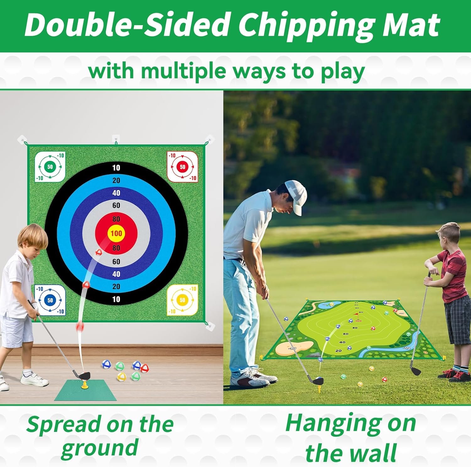 NEW DOUBLE SIDED CHIPPING MAT: 59.1 x 59.1 inch Large double-sided chipping mat of golf chipping game provides two modes: realistic putting green and ball toss scene, you can switch as needed. Equipped ground stakes and sticking hooks keep mat firmly in place