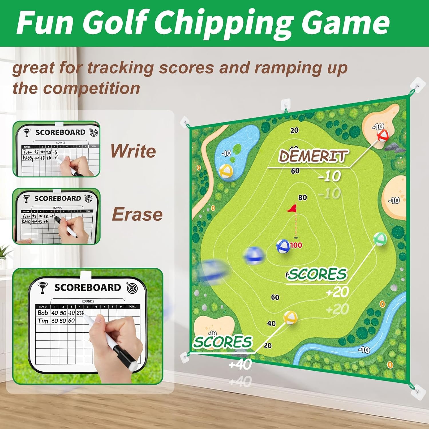 OUTDOOR INDOOR FUN: Whether in backyard, lawn or living room, our chip and stick golf game set can be carried anywhere conveniently as a removable toy, allowing your family and friends to improve golf skills and hand-eye coordination while having fun