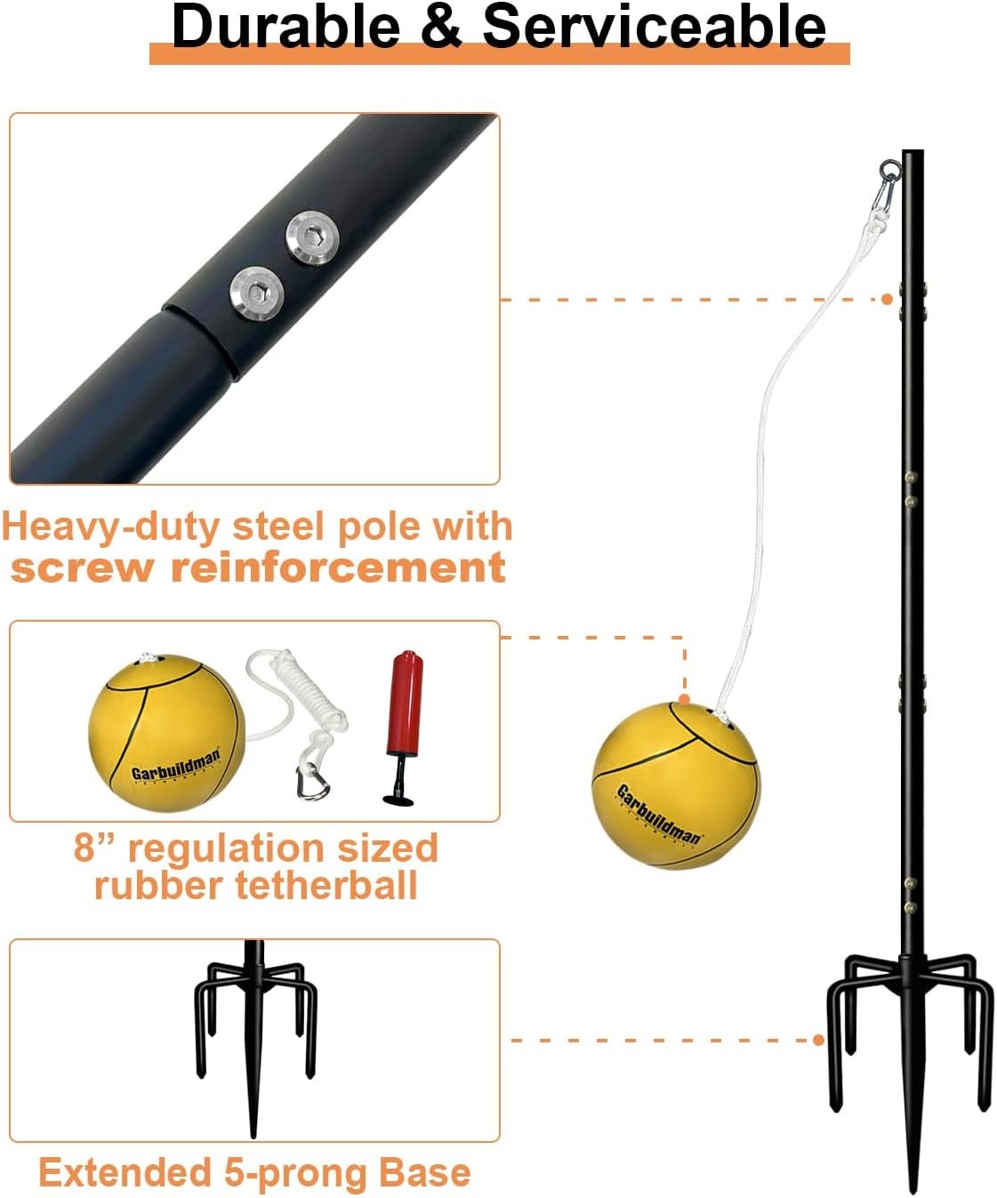 Upgraded Screw Reinforcement: 15-inch extended 5-prong base provides this tetherball pole set with stronger support. Made of durable and high-quality metal, including sturdy 1.0” thick Screw Reinforced poles, 8″ regulation sized rubber tether ball with pump and a reliable base, ensuring a long service life without worrying about damage or wear and tear.