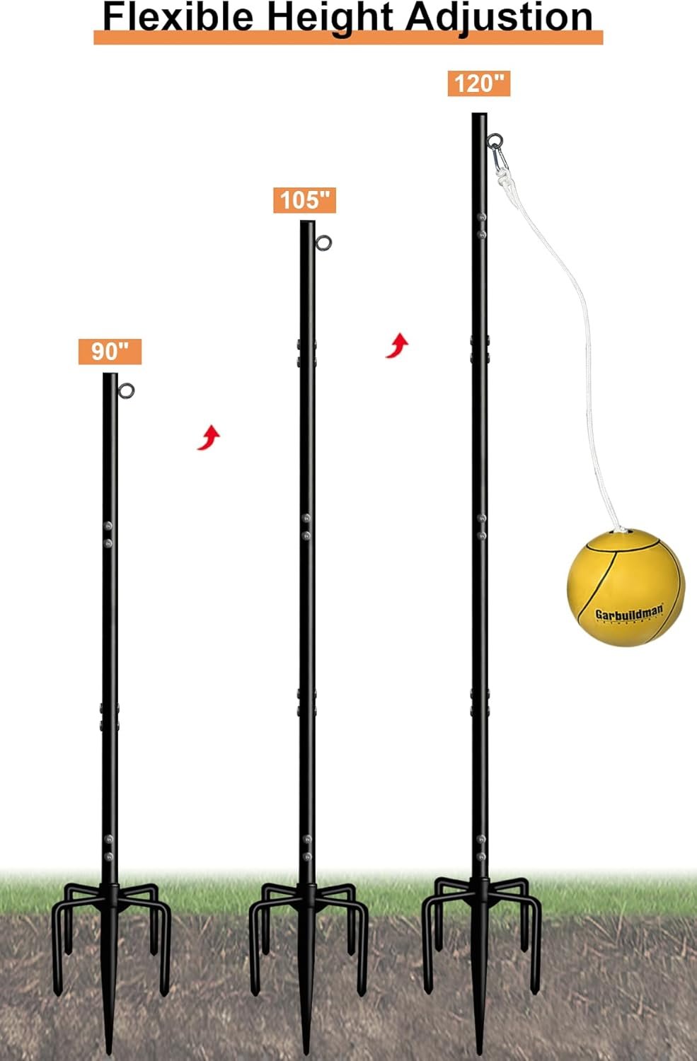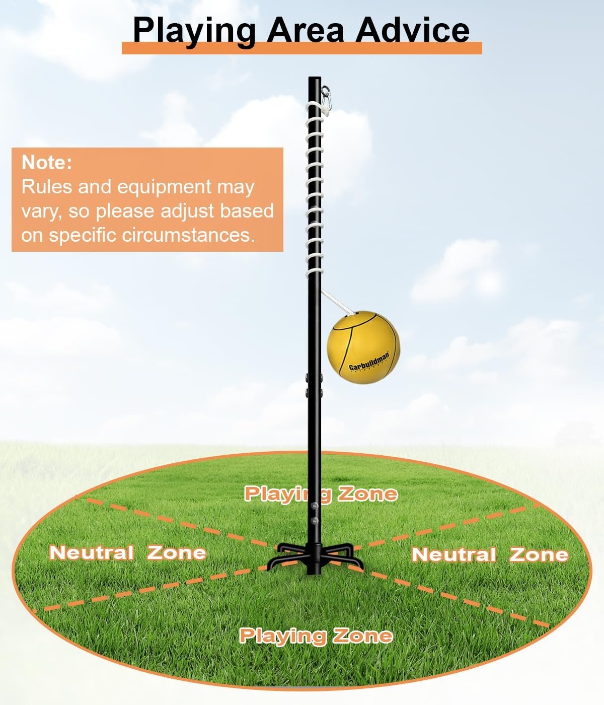 Please make sure each part of the pole is completely tightened. Please insert the fork end into the ground completely to finish installment. We don’t recommend putting the pole into soft moist soil, which may cause the pole to tip over or bend down.When not using Garbuildman Tether Ball Game Set, please put it away to prevent accidental injury on people, children or other things.