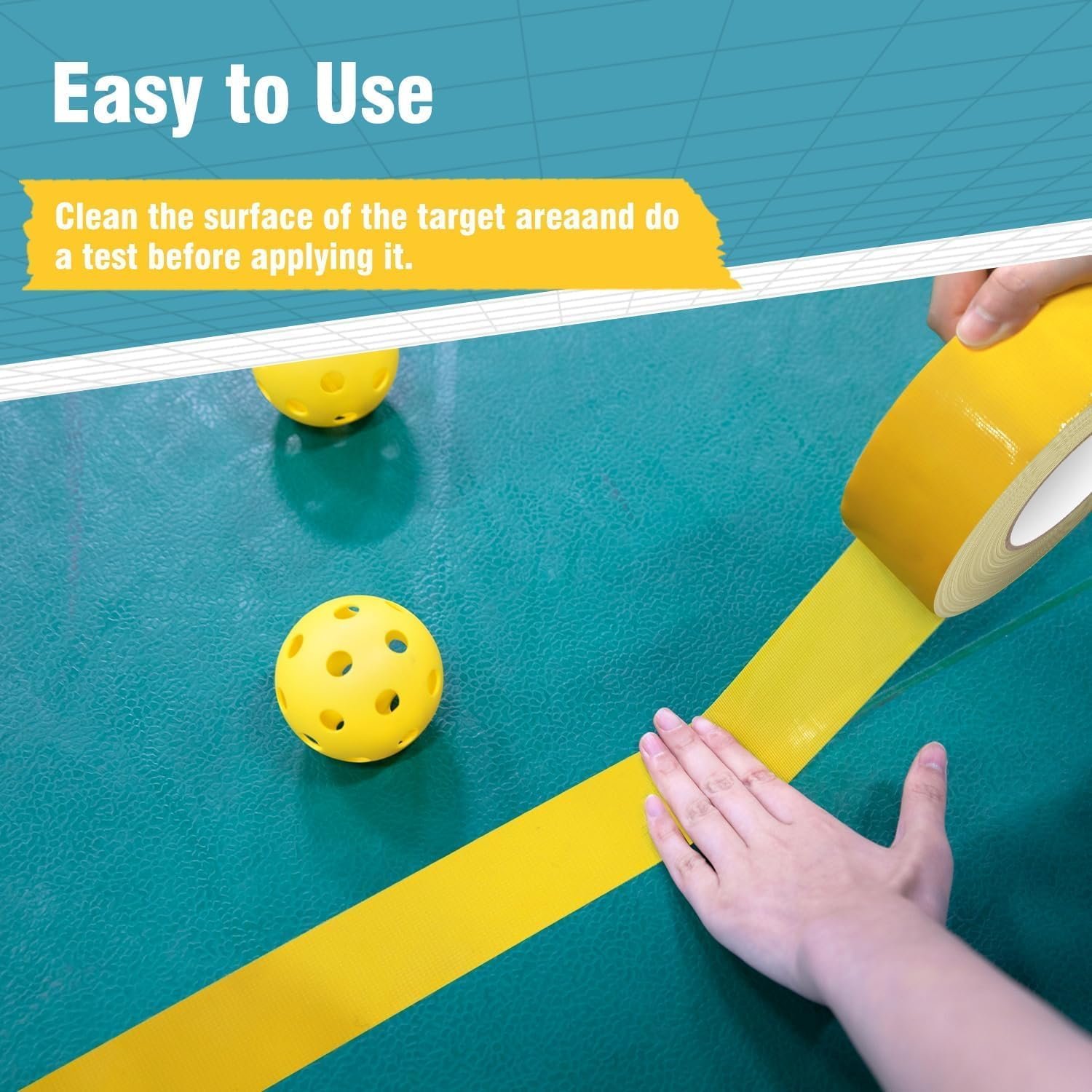 [Without residue] Keep your floors clean before applying the tape. You don’t need to worry about damaging your playing surface, as our removable pickleball lines peel away easily and leave no residue. Just make sure the surface is free of dust and debris before applying.