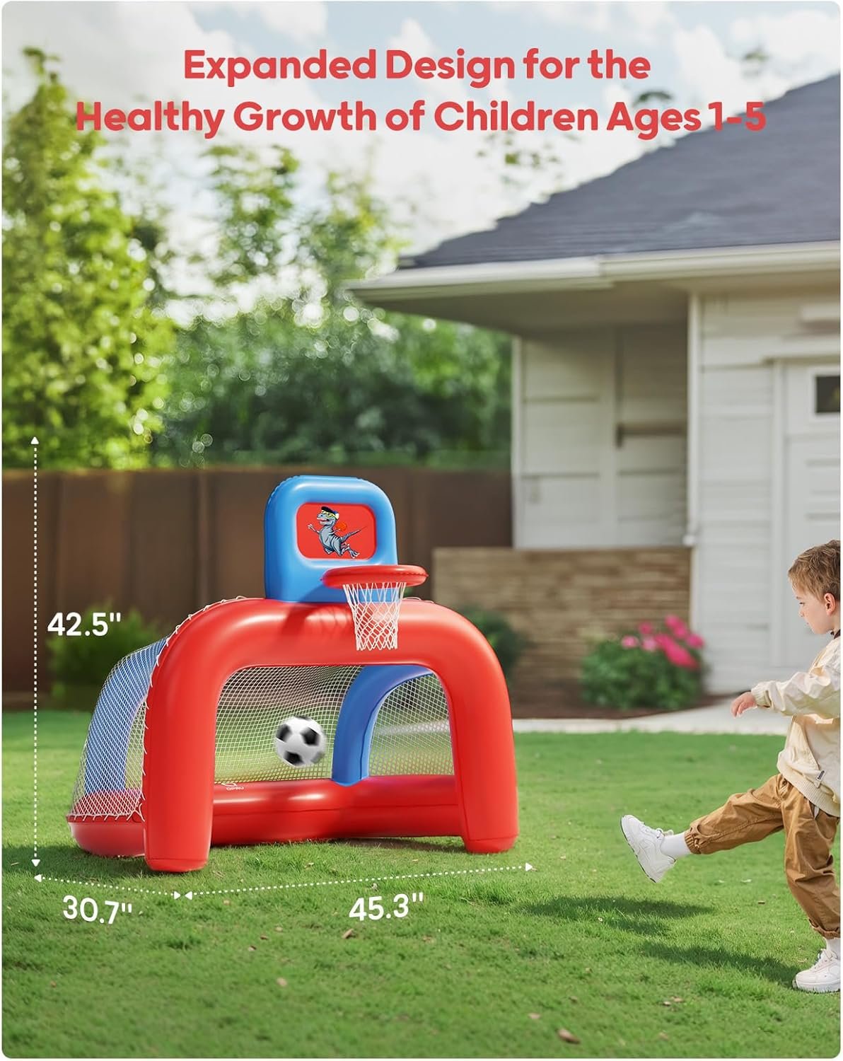 Large Size for Ages 1-5: Bright colors and fun design with an enlarged size 30.7″ x 45.3″ x 42.5″. It allows kids to play comfortably both indoors and outdoors, sparking their interest in sports.