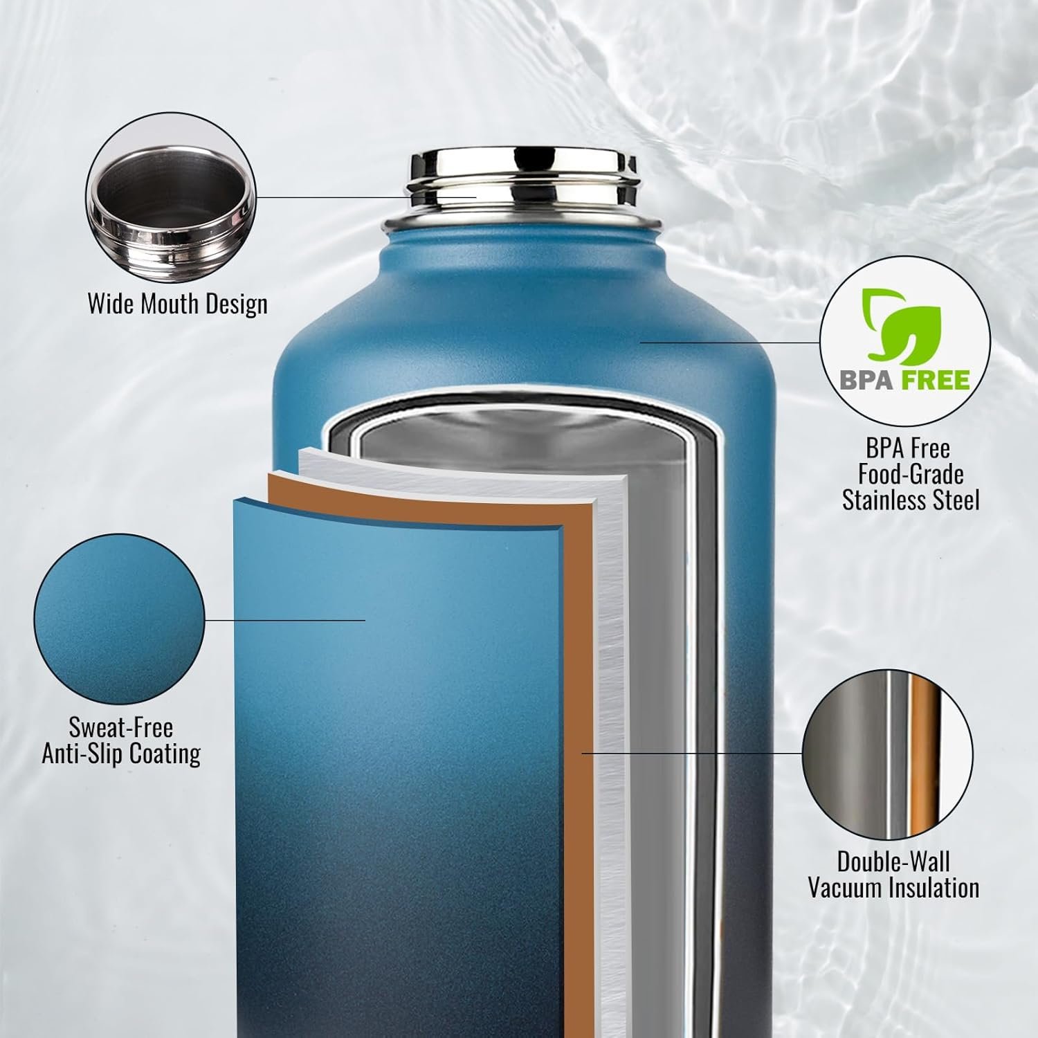 【Premium Safety & Sweat-Proof Design】 Our stainless steel water bottle made with food-grade 304 stainless steel. With a sweat-proof, non-slip coating and being bpa-free, our insulated water bottle is a reliable companion for all activities.