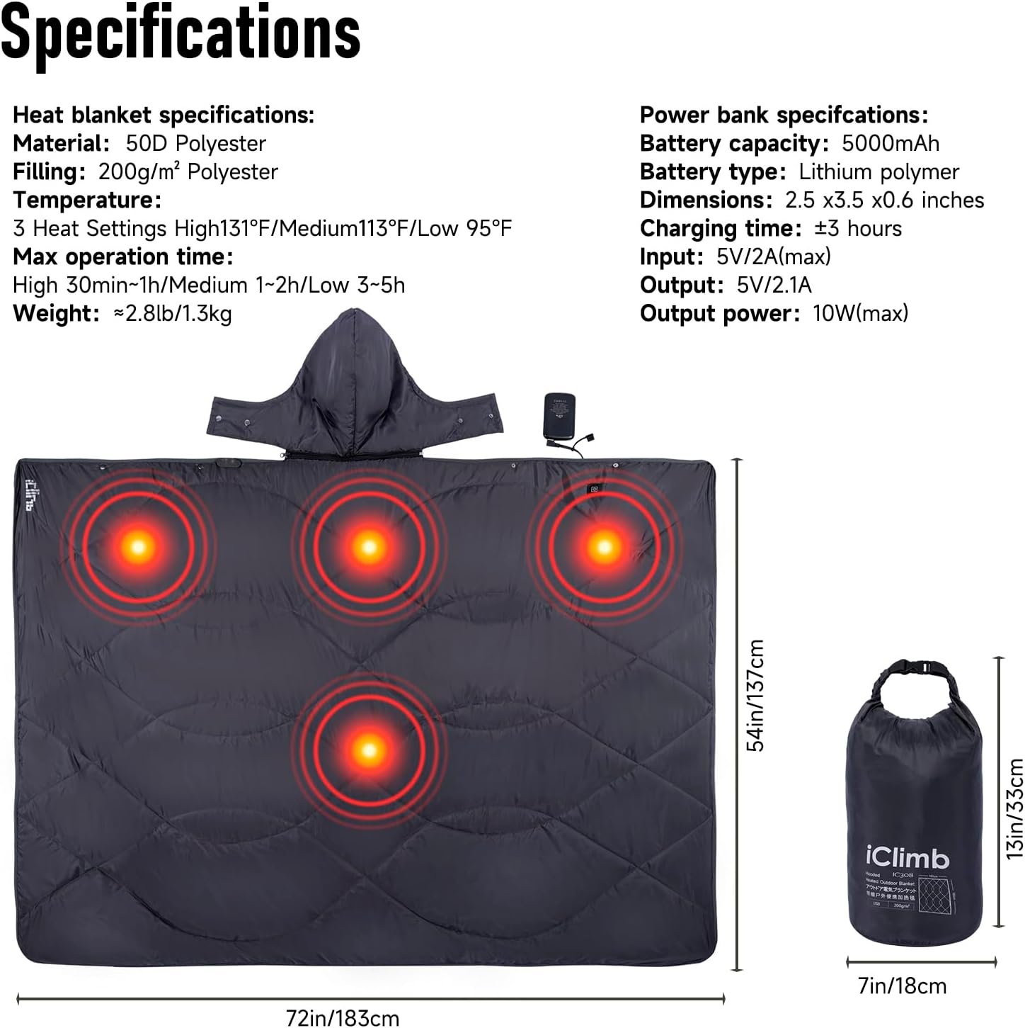 SURROUNDED BY WARMTH With USB Battery Pack, this heated blanket will keep you warm wherever you go. (Battery pack required to use the blanket’s heated mode.) COMFORTABLE and WEATHERPROOF 50D polyester fabric and 200 g/m2 polyester insulation, this blanket is ripstop, durable, windproof, water resistant, super soft and comfortable. LARGE with DETACHABLE HOOD Unfold size 6’ × 4’6”, 4-zone heating, wrap yourself in warmth and comfort with our innovative heated blanket featuring a detachable hood. 5 HOURS HEAT With 5000 mAh included lithium-polymer battery, you can take this blanket on the move with up to 5 hours of heat (Low Mode). THREE HEAT SETTINGS Low (95℉/35℃) for 3–5 hours, Medium (113℉/45℃) for 1–2 hours, and High (131℉/55℃) for 30–60 minutes—let you adjust the warmth to fit any situation. (Please check the power bank’s max runtime per mode before ordering to avoid returns.) ULTRALIGHT, COMPACT, PORTABLE Only weighs 2.8 lbs, packed size 13” × 7” × 7”; Stuff sack with buckle, which can be used as handle, easy to carry everywhere. MACHINE WASHABLE Spot-clean as needed with a damp sponge. Machine-wash only when necessary in a large capacity, front-loading washing machine. Keep the connector cable back inside of the pocket, and make sure the pocket is fully zippered closed before washing the blanket. Select cold water and a delicate cycle with two rinses and an additional spin cycle. MULTIFUNCTIONAL With the buttons, this blanket can be used as quilt, poncho and shawl, and it won’t slip off your shoulders. Enjoy warmth and comfort in the car, office, outdoors, or at home, letting warmth accompany you anytime. VERSATILE Great for camping, backpacking, hiking, trekking, tailgating, hunting, fishing, mountaineering, motorcycling, traveling, skiing, snowboarding, lounging, picnics, concerts, music festivals, beach trips, sporting events, airplane trips, and other outdoor activities. What You Get 1 Heated Blanket, 1 Detachable Hood, 1 5000 mAh Power Bank, 1 USB Cord, 1 Instruction, 1 Carry Bag; 1-year limited manufacturer for quality-related issues.