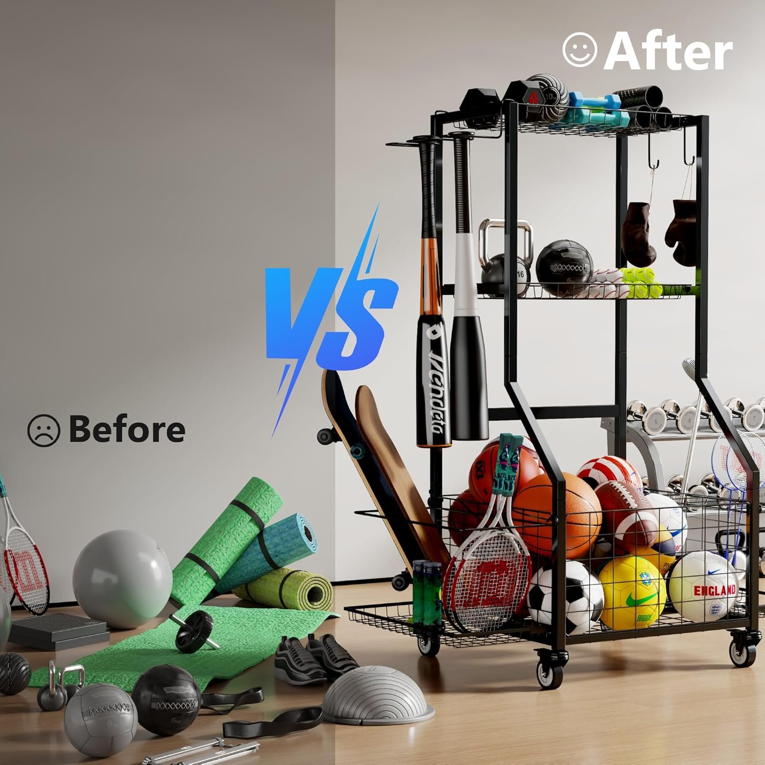 Garage Storage for Sports: This versatile sports storage cart features a large main storage basket and two tiers of equipment baskets for securely holding balls and sports gear, alongside two side racks: one open-frame rack for skateboards, yoga mats, and foam rollers, and another with padded racket dividers designed for tennis rackets, providing a convenient storage solution to help you clear the clutter and keep your space organized.