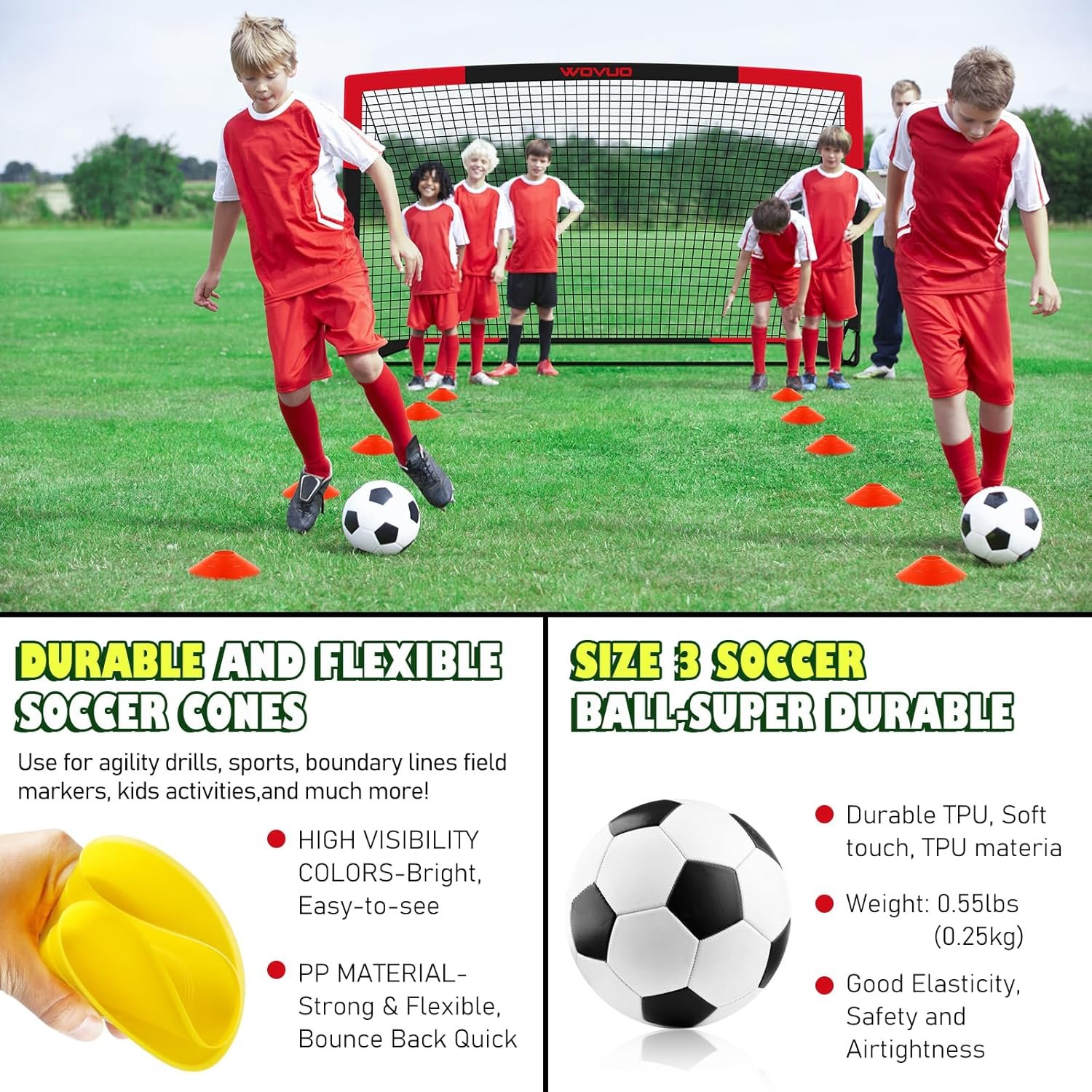 Complete & Valuable Soccer nets for backyard: One soccer goal kit includes all soccer stuff accessories. 6×4 pop up soccer goals set of 2, 1 soccer goal target, 1 size 3 soccer ball, 1 pump with needle, 10 soccer cones, 10 U-shaped metal ground stakes, and 1 carrying bag. Whether you’re honing your soccer skills of shooting accuracy and goalkeeping or organizing a friendly soccer tournament, this portable soccer net will be the centerpiece of unforgettable moments.