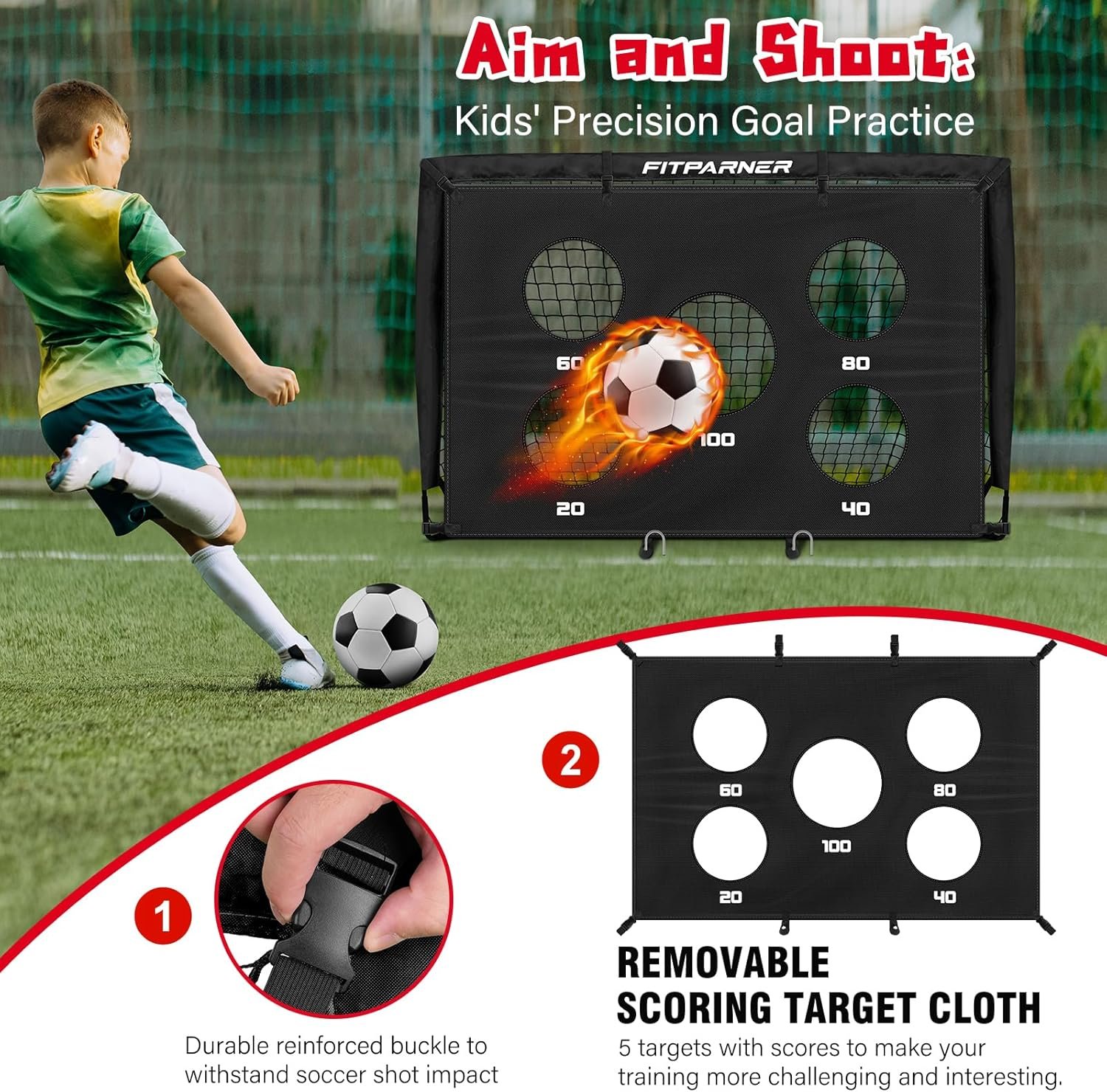 With target cloth for soccer practice:This soccer set is equipped with a detachable target cloth,Featuring 5 scoring target zones to keep soccer drills fresh, enables kids to complete soccer training alone, develop shooting skills even without a goalkeeper.Perfect for fostering a love for soccer game and developing essential soccer skills in young players.