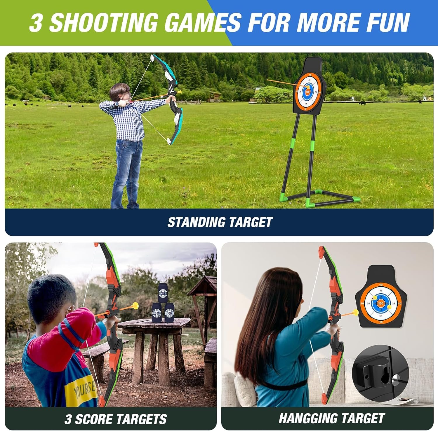 [3 Different Types of Targets] -①Standing target. ②Wall-mounted target(detach from the standing target). ③6 Score Targets(from 25-50-100). Bring you more shooting fun! We come with clear instructions so you can easily assemble the height-adjustable standing target. A wall-mounted target can be hung on a wall or tree. Bow and arrow provide an endless fun and goal experience for kids!